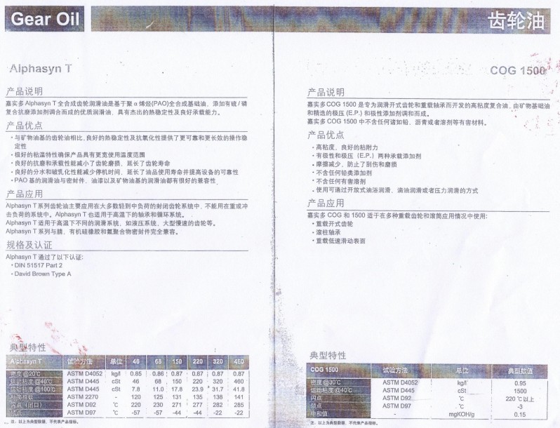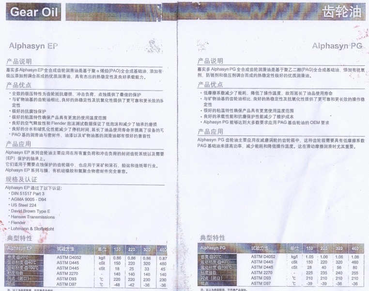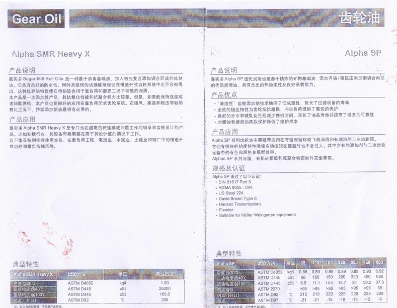 Alpha SP系列 簡介:卓越的機(jī)壓性能,有效延長齒輪的使用壽命;可減少腐蝕,防止齒輪磨損;具有優(yōu)異的熱穩(wěn)定性,具有良好的抗乳化性和低泡沫性;超過DIN51517 Part 3(CLP)標(biāo)準(zhǔn);得到了多家主要變速箱制造商認(rèn)可,如Flender、Hansen、David Brown等。 |