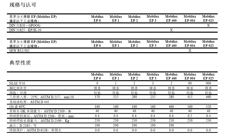 美孚力士滑脂 EP (Mobilux EP) 系列 0, 1, 2, 3, 460, 004 和 023 是一系列高性能潤滑脂,其中的五種為通用工業(yè)潤滑脂, 兩種為專用半流體潤滑脂。 這些羥基硬脂酸鋰基潤滑脂是配制用來提供超級抗磨、防銹蝕和抗水沖洗等保護性能。它們分為 NLGI 00 級至 3級,基礎(chǔ)油粘度為SO VG 150、320 和 460。 美孚力士滑脂EP 系列 (Mobilux EP) 0, 1, 2, 3 和 460 潤滑脂適用于大多數(shù)的工業(yè)應用類型,包括高單位壓力或沖擊載荷的重型應用。這些潤滑脂的抗銹蝕和腐蝕以及抗水沖能力極佳,特別適合于經(jīng)常處于潮濕條件下的設(shè)備。美孚力士滑脂 EP 0 和 1 適宜集中潤滑系統(tǒng)施用。 美孚力士 EP 2 和 3 為通用潤滑脂,美孚力士 EP 460 用于重型應用,例如造紙機械的濕部,推薦應用溫度在 -20oC 至 130oC范圍內(nèi)(美孚力士滑脂 EP 460 為 0oC 至 130oC),但若相應增加潤滑脂的添加頻率,還可用于更高溫度。